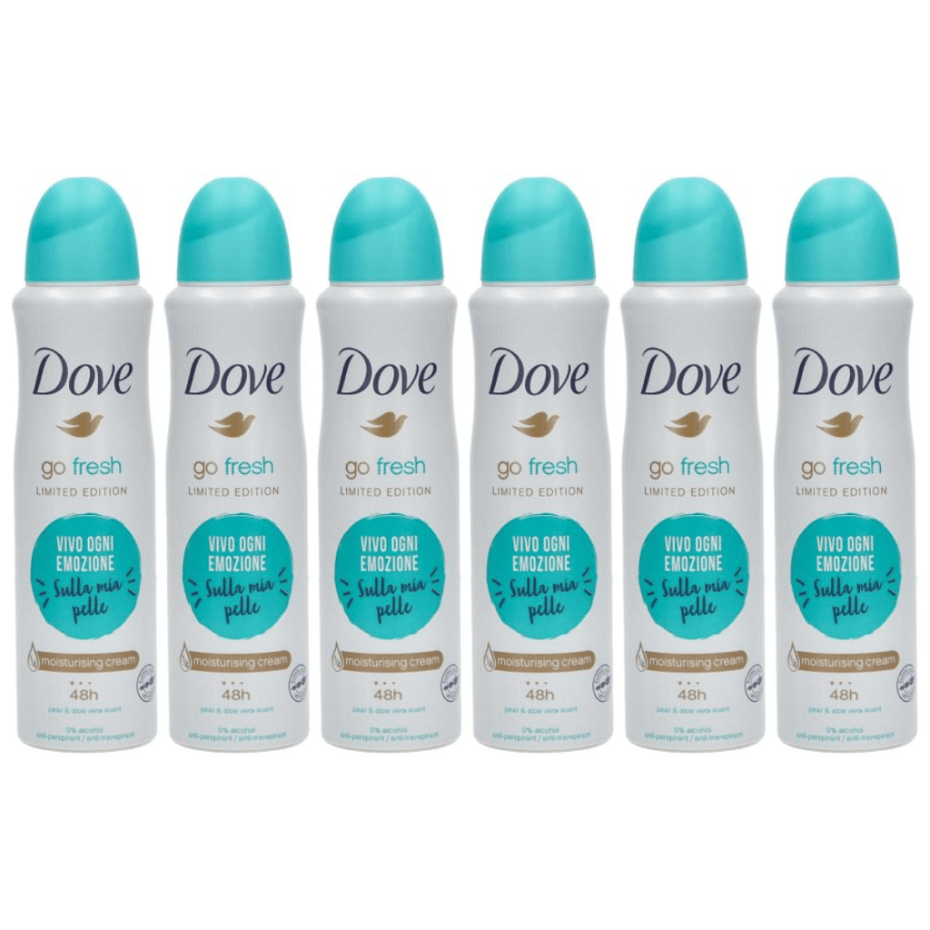 he unique Dove 1/4 moisturizing cream formula leaves underarms smooth & softEnjoy a cool, refreshing application that provides 48 hour protectionGoes on instantly dry for a cleaner feel 48-hour odor and wetness protection Clinically Proven Non-Irritant Formula 1/4 moisturizer technology Tough on SweatJuicy pear and refreshing aloe vera scent6 Pack Dove Go Fresh Pear & Aloe Antiperspirant Deodorant Spray, 150ml each