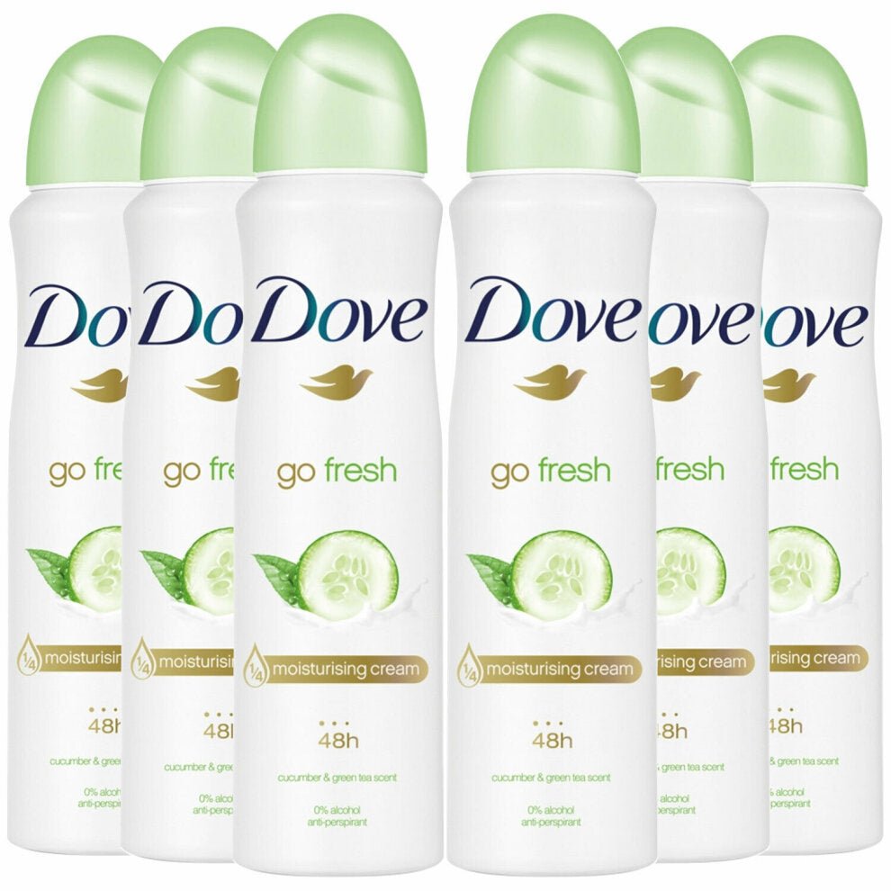 Dove Women Anti-Perspirant Deodorant Spray, Cucumber & Green Tea, 150ml - 6 Pack Cucumber & Green Tea antiperspirant a soothing and refreshing combination of natural goodness. Unite them with refreshing odour protection and you’ve got Dove Go Fresh Cucumber & Green Tea Deodorant. RELIABLE DAILY PROTECTION : This deodorant spray keeps you odour free effortlessly. Our Go Fresh Cucumber & Green Tea Deodorant ensures up to 24 hours of freshness, giving you the confidence to get on with your day. FEEL FRESH WITH DOVE GO FRESH : With a cool, crisp cucumber and green tea fragrance, this uplifting deodorant adds an extra burst of freshness to your routine. It’s the perfect way to start the day, helping you to feel fresher for longer. 1/4 Moisturising Cream With added 1/4 moisturising cream to help underarm skin to recover from irritation caused by shaving, leaving you with softer, smoother underarms 48 Hour Protection Providing up to 48 hour protection against underarm wetness and odour. Cucumber & Green Tea Refreshing cucumber scent paired with a green tea fragrance. Key Features : Dove Go Fresh deodorant with 0% aluminium salts and 0% alcohol. Contains ¼ moisturising cream for soft and smooth underarms. Keeps you fresh for up to 24 hours. Refreshing Go Fresh cucumber and green tea scent. Keeps underarms perfectly fragranced all day. Comes in an easy-to-apply deodorant spray. How to Use : First, shake the can to make sure all the ingredients are properly mixed together. Then hold the can 15cm away from your underarms (that’s just by your elbow, if you haven’t measured your arms recently) and spray in a sharp burst. Ingredients : Butane, Isobutane, Propane, PPG-14 Butyl Ether, Cyclopentasiloxane, Parfum, C12-15 Alkyl Benzoate, Triethyl Citrate, Helianthus Annuus Seed Oil, Ethylhexylglycerin, Glycerin, Niacinamide, BHT, Octyldodecanol, Tocopherol, Alpha-Isomethyl Ionone, Benzyl Alcohol, Butylphenyl Methylpropional, Citronellol, Coumarin, Hexyl Cinnamal, Limonene Ingredients correct at time of publishing. Always check product packaging. Cautions : Avoid direct inhalation. Use in short bursts in well-ventilated places, avoid prolonged spraying. Use only as directed. Keep out of reach of children. Do not spray near eyes. Do not use on broken skin. Stop use if rash or irritation occurs. Do not pierce or burn, even after use.
